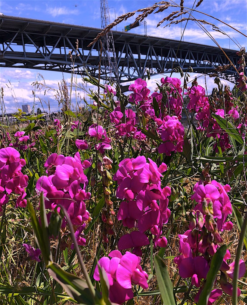 So today at the office I took a lunch expedition, forging a new route to some nearby waterfront. There were lush patches of beach roses in pink and white, feathery wild fennel just blooming with its gold compound flowers, wild blue rosemary and lavender, California gold poppies, and right here some sweetpeas and skyline.