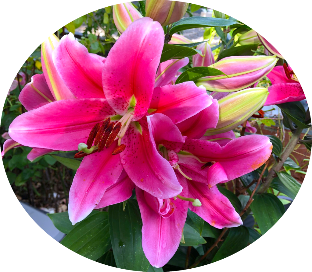 Mr. P’s potted lilies are a wild success this year. At sunset they have a wonderful romantic show-stoppy scent that stops people right in their tracks on their way to the garbage dumpster or laundry room.