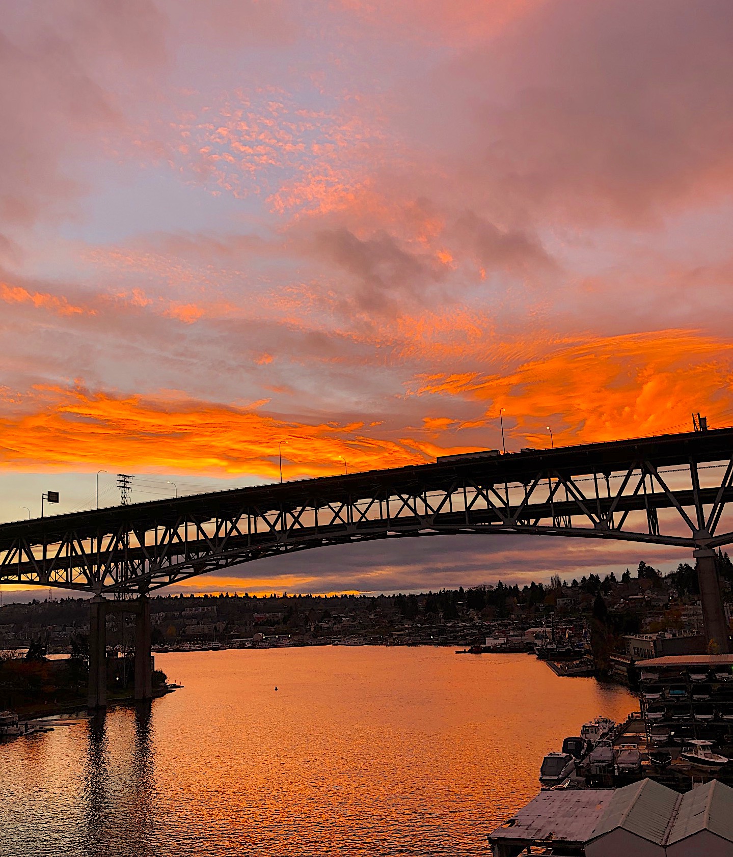 Here is a bridge over water during tonight’s sunset, against a tangerine sky. It’s a different bridge from the one in this post.