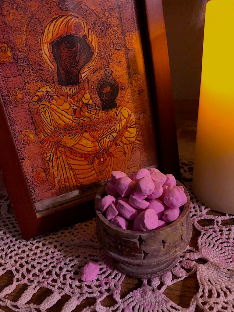 This is a small picture of the Panagia Portaitissa icon of the Blessed Virgin Mary. The original is kept at the Georgian Iveron Monastery on Mount Athos. There is also a battery candle, and a bowl of pink incense tablets scented with rose oil.