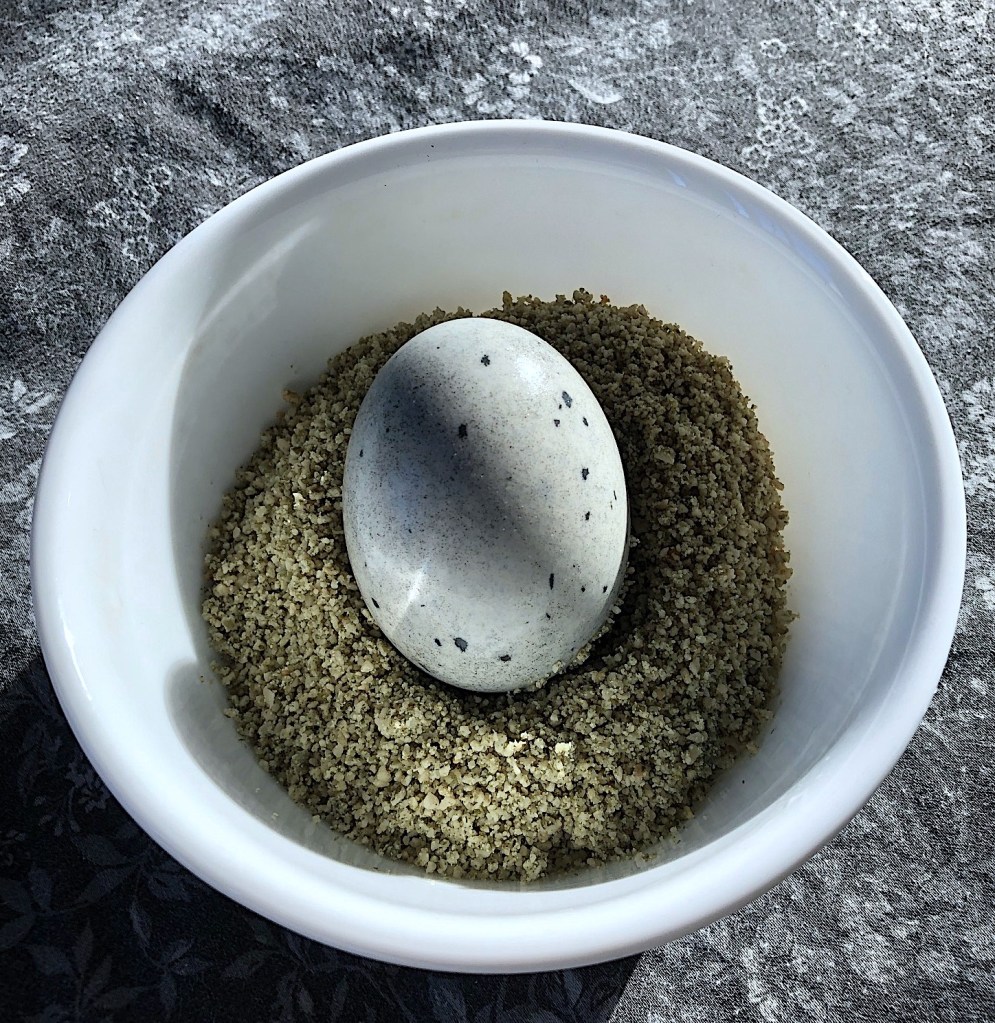 That new bed sheet has been such a hit, and is moreover such an attractive pattern, that it seemed a natural match for one of Mrs. Wing’s pickled duck eggs. I added ground punkin seeds for texture, and put them all together in a shaft of wintry late-afternoon light. The result made me happy. It reminds me of some modern art poster from a warehouse loft museum with hardwood floors and stark white walls and soaring industrial ceilings and exposed copper pipes. But it’s really just my floor with a sheet on it and a bowl with an egg.