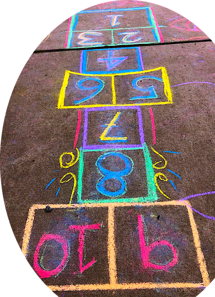 Other adults, some of them total strangers walking by, grabbed chalk and helped. Then for the hopscotch game we got some flat rocks to toss on the board, and tried to remember and figure out how to play while making up any rules as needed. My contribution was remembering that the flat rock is called a potsy, and on the way back to square one when we land on the potsy square we have to bend over on one foot to pick it up, calling out “Butterfingers!” Of course, those are New York rules, and the honorable opponent from Mexico had a different set of rules, which was different from Vancouver and Ohio rules. Then as more total strangers walked by we asked them to referee rules for us. Then as various unsuspecting grownups came to take out their garbage, Neighbor D. explained to them that from now on, the rule is that to access the garbage cage, you have to at least walk over the board. The surprise was that nobody turned us down; everybody tried at least walking or hopping, and some even threw in fancy backwards hopping and other tricks. Even when suppertime came and it started raining we big people stayed out for 90 minutes throwing potsies and making up rules and taking turns with the chalk. Between turns, on the far side of the hopscotch board people added big chalk flowers and hearts and smiles and frills and Peace and Love and Understanding. Finally it was getting dark and chilly, and we put the floor mat back where it belonged and headed indoors.
