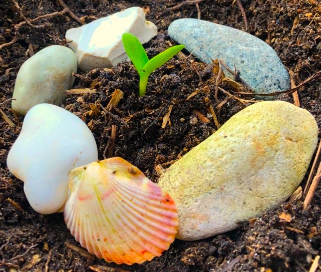 Experience also shows that on Day 10 these guys belong in the ground. By then they are two inches tall and ravenous for light. Despite frequent rotation they will twist around to follow the sun and will get gangly stems. Plus they already have a tap root and side roots the same size as the seedling or more. So today I took the dozen largest, and planted them outdoors. Then to let the neighbors know that these are plants and not weeds, I picked out lighter-colored stones from the rock bed, and made little crop circles around each seedling. (It was nice that the sun lit up the inside of that little scallop shell.)