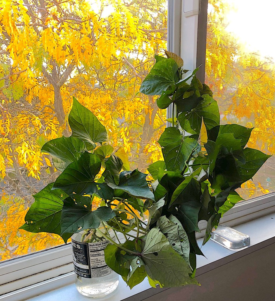 By summer’s end, the lovely white blossoms had died, leaving only greenery. Meanwhile my happy sweet potato vines spread everywhere, a ground cover of root suckers and vines all along our raised bed. Now while clearing those vines, in one stroke I had disturbed the precious white roots growing under the plant’s leaves — which just happen to be heart-shaped and rich green. The beautiful website “China South of the Clouds” at this link