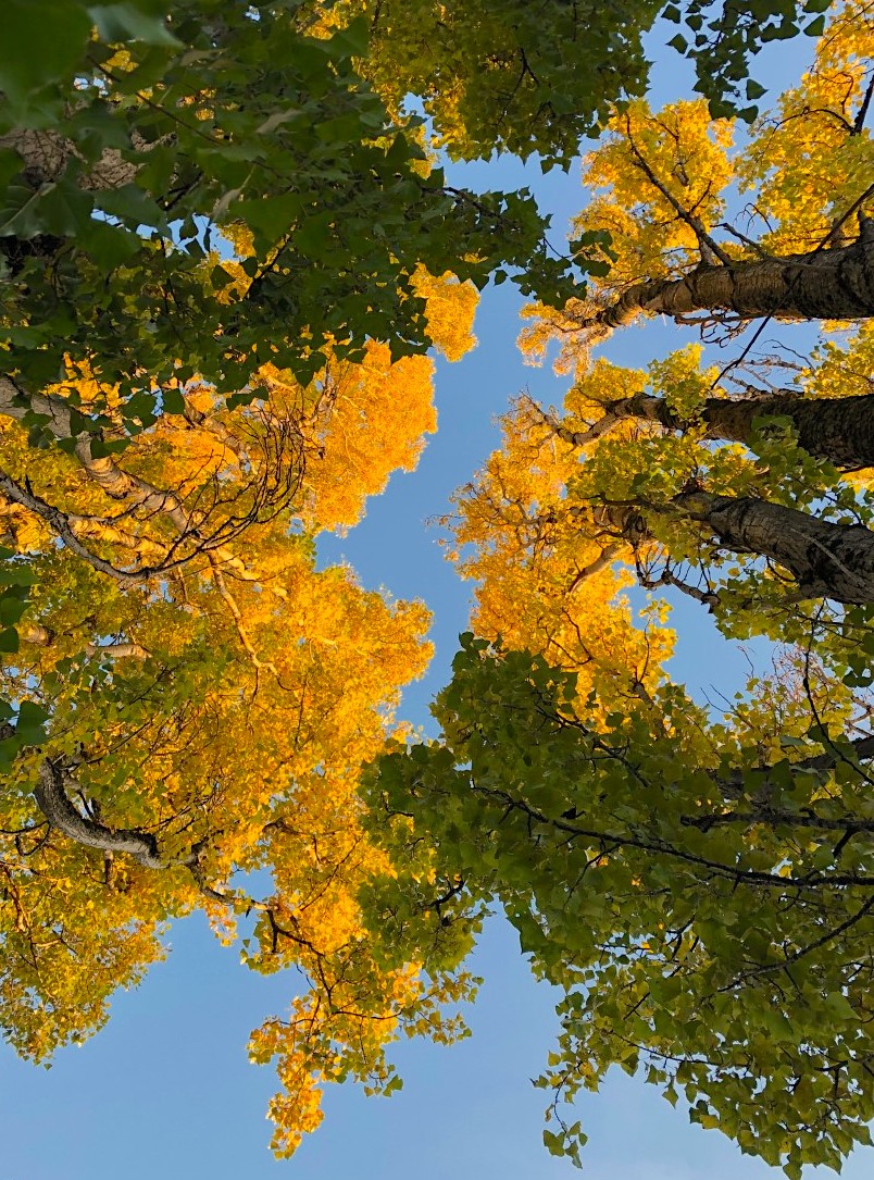 Here are some implausibly tall cottonwood trees (the picture can’t do justice to their towering height or the glorious sunshine), losing their leaves in a high ray of light from the setting sun.