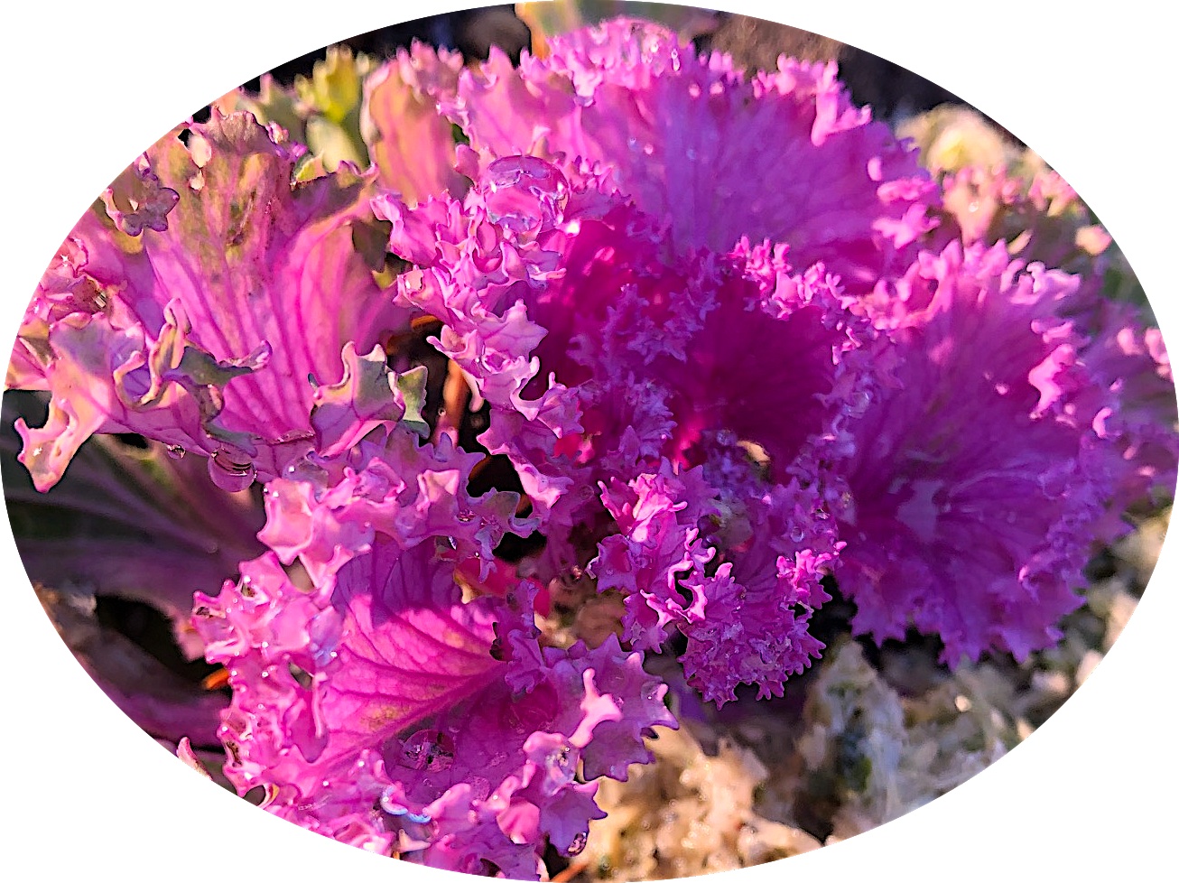 This week saw the start of a new winter season. Last night at bedtime there was soft steady rain. But before dawn, there was a wake-up surprise: at eye level right outside through the screen at the open balcony door, a foot away from the bedroll and pillow, there were inches of snow! It all melted with sunrise, and the day turned clear and brisk with an early moon (84.7% full, waxing gibbous). In the garden, here was some of my frozen flowering kale in the early sunshine.