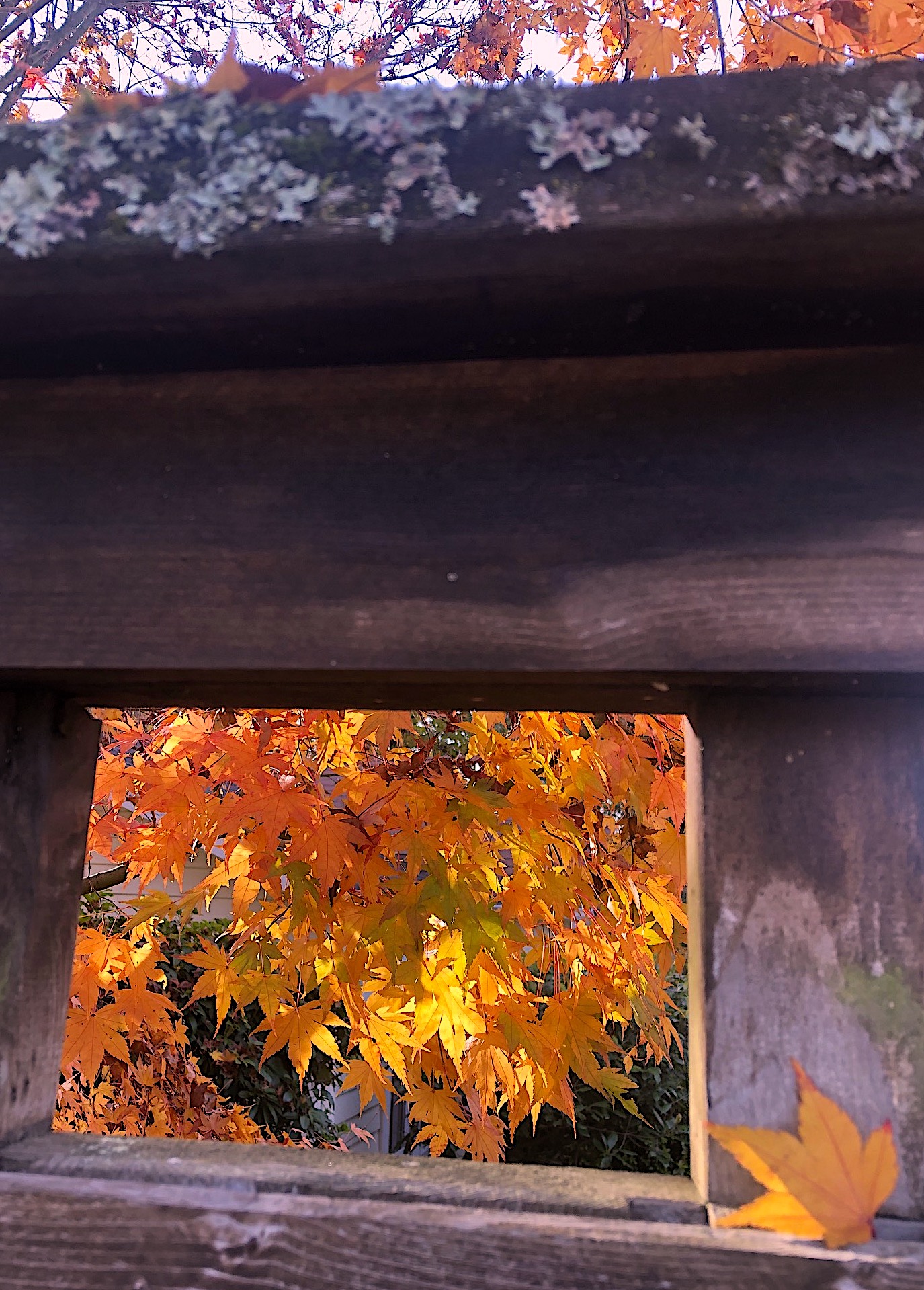 Here below is a sturdy wooden fence with a genteel tempering of lichen. A random side glance through a space in the frame revealed this glimpse of the garden inside.