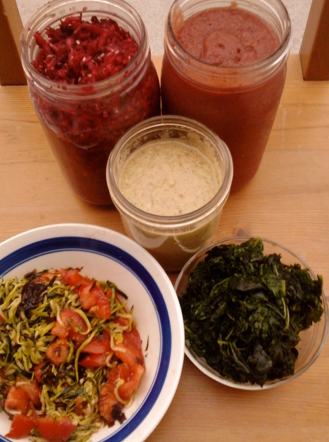 slaw, cran-smoothie, zukechoke soup, raw pasta, hammered kale