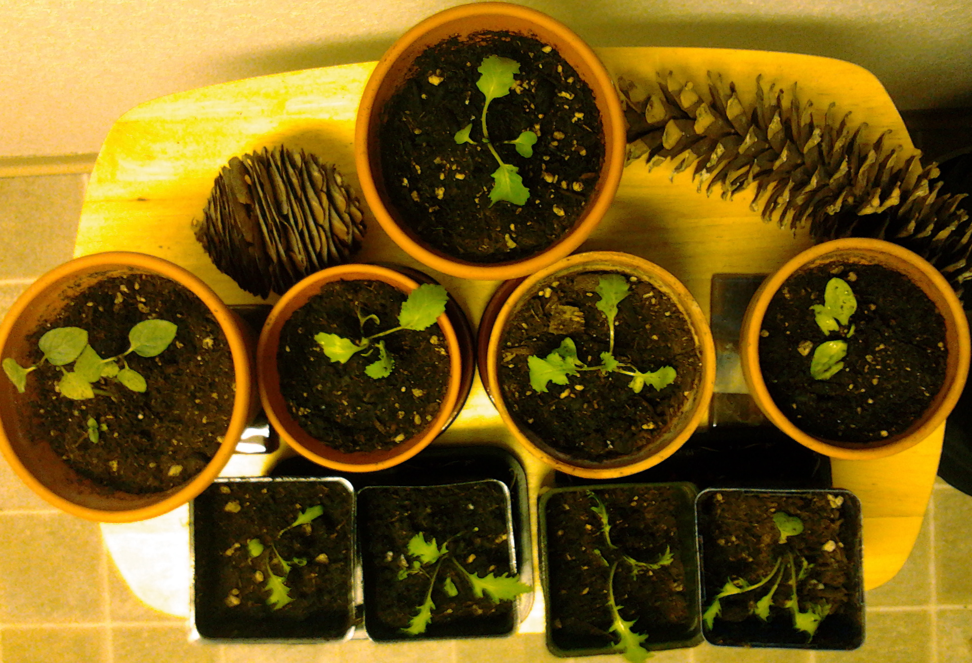 Then I planted 5 tiny Russian Red Kale seedlings, and now water them twice a day with buckets of dishwashing/cooking water. Here are 3 of the 5 plants, below. Can you see them? Maybe you can if you were the kind of kid who clapped your hands to save Tinkerbelle:
