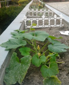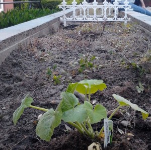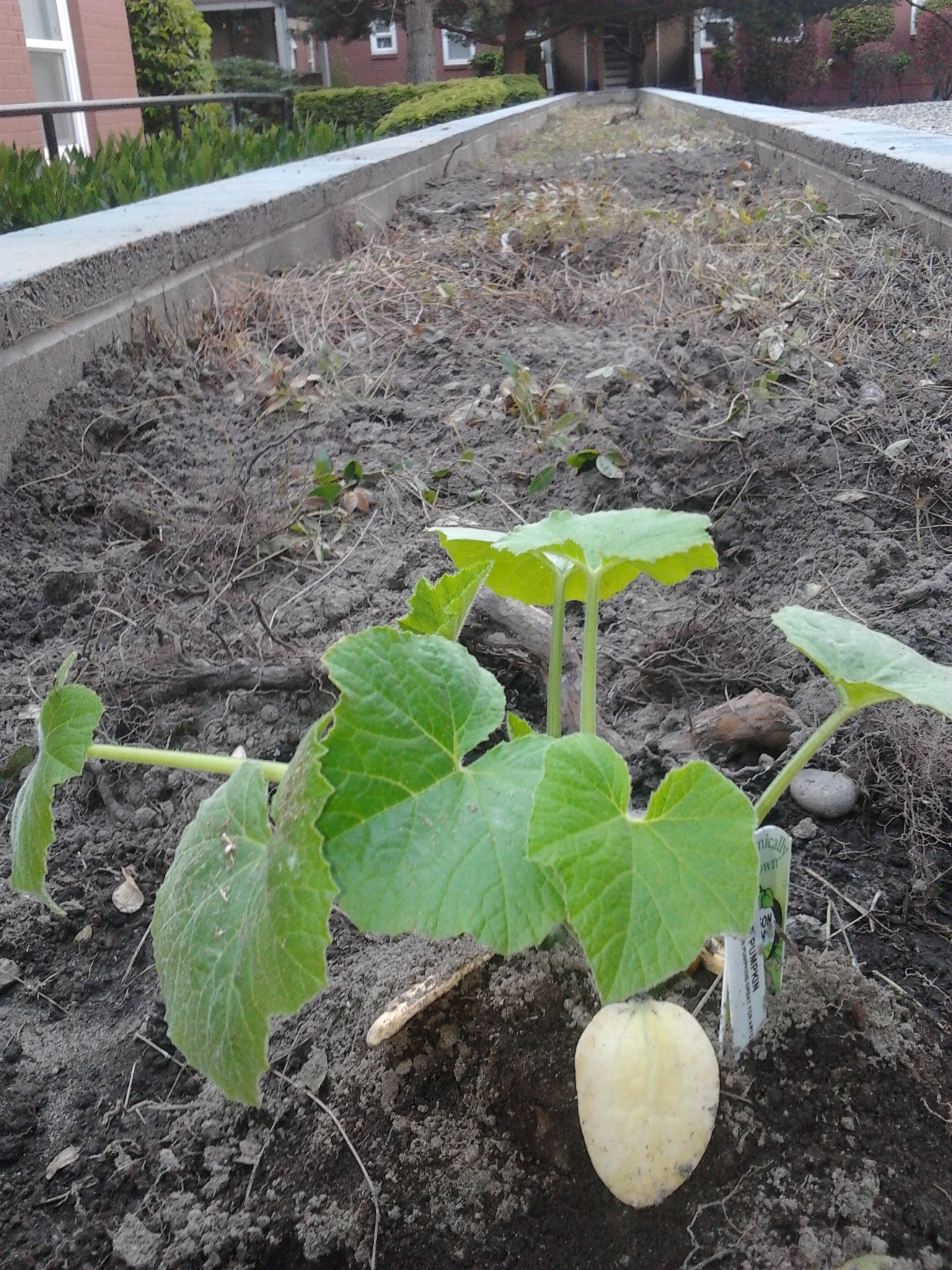 Nice things are already happening with this garden. One neighbor stopped to watch and actually said “Tell me what kind of seeds you need, and I will go out and buy them for you.” Another tenant bought a punkin plant and dropped it off at the office as a contribution! That leaf at front and center died, but the other leaves are still hanging in. Now it’s the big tourist magnet at the south end: